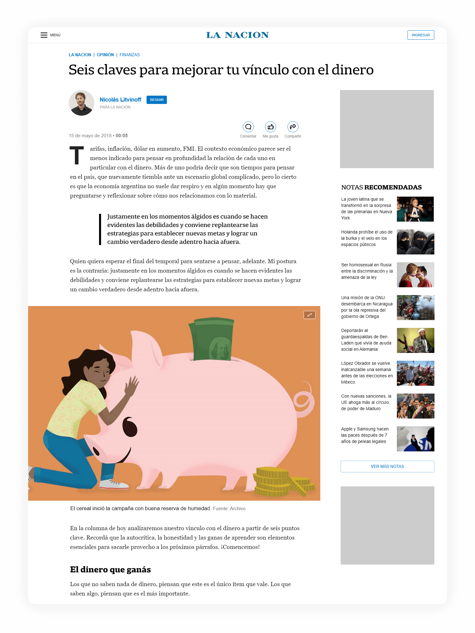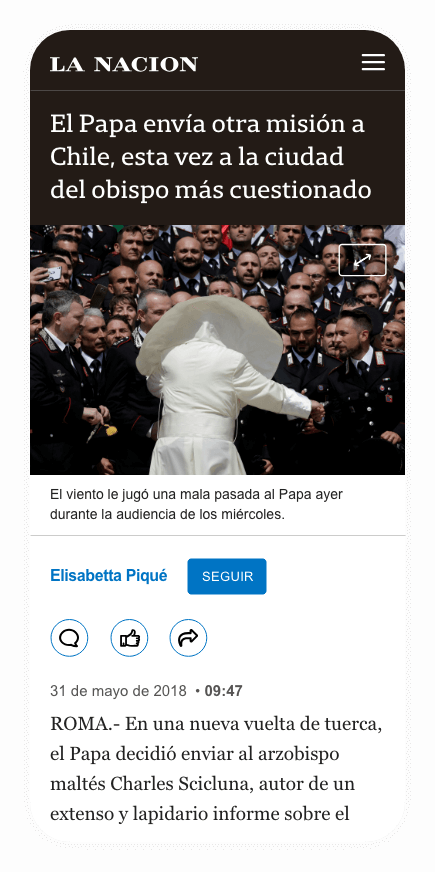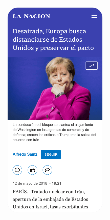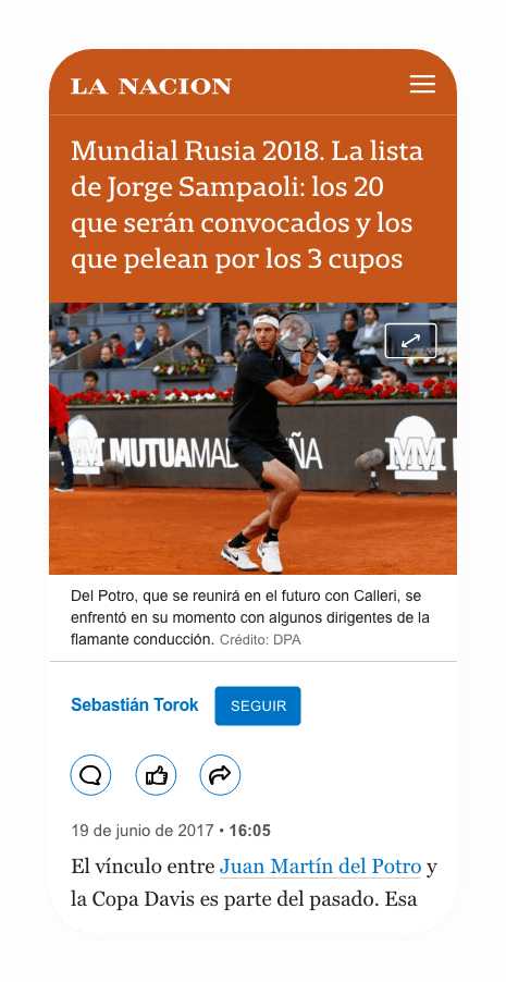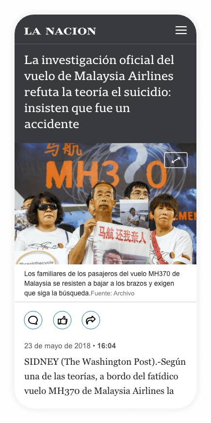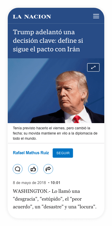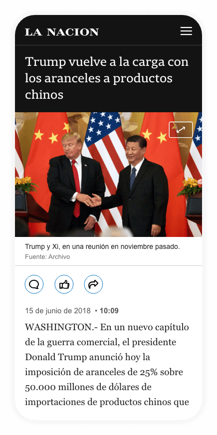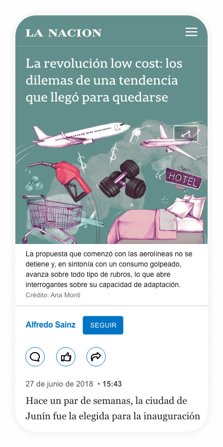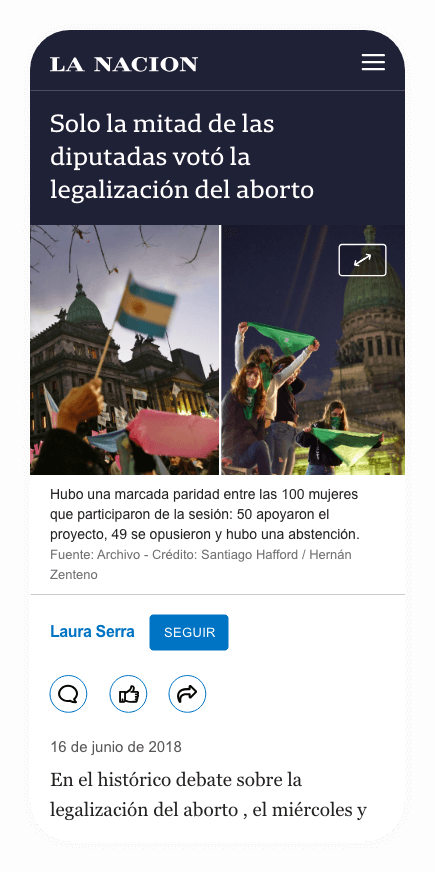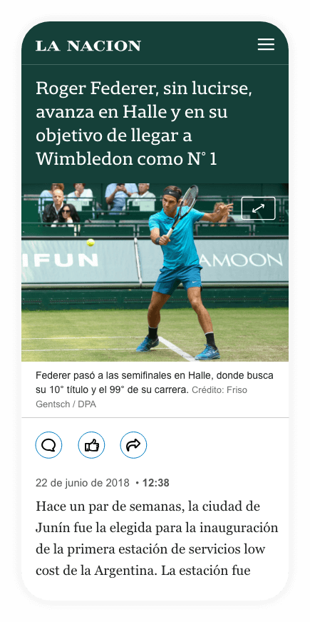 LA NACION es uno de los principales diarios digitales de argentina. Posee 6 millones de usuarios únicos mensuales. Ofrece su contenido en versión web • web mobile • app Android • app iOS. A partir del 2017 el 80% de los usuarios provienen desde web mobile.