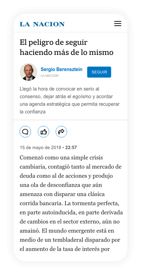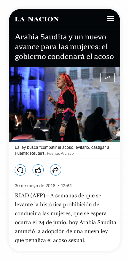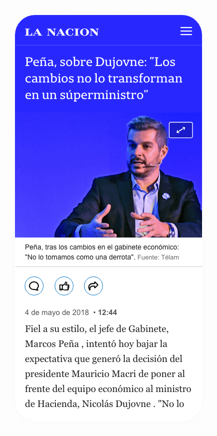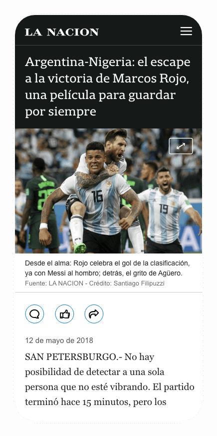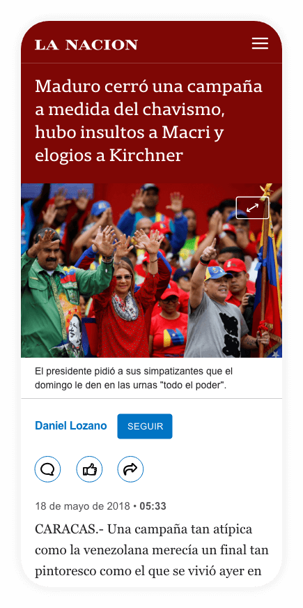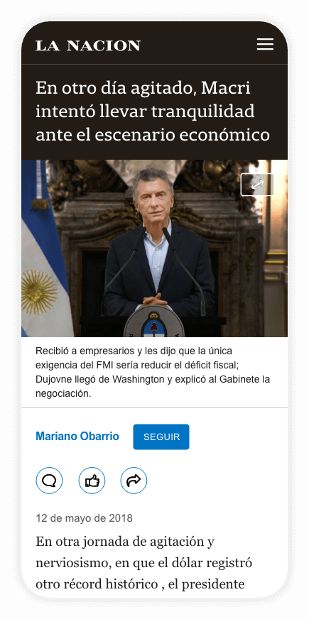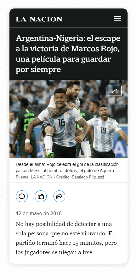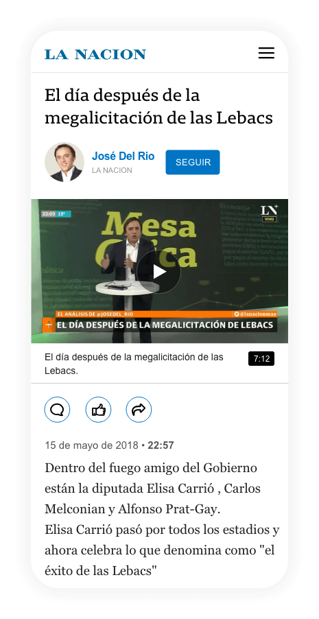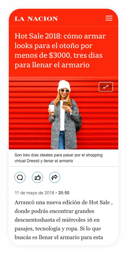 LA NACION es uno de los principales diarios digitales de argentina. Posee 6 millones de usuarios únicos mensuales. Ofrece su contenido en versión web • web mobile • app Android • app iOS. A partir del 2017 el 80% de los usuarios provienen desde web mobile.
